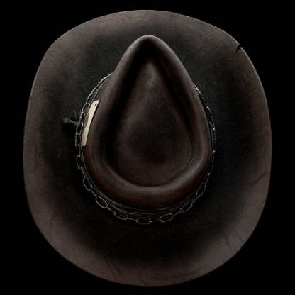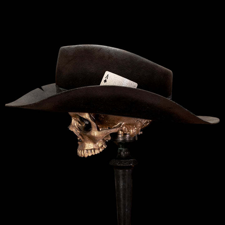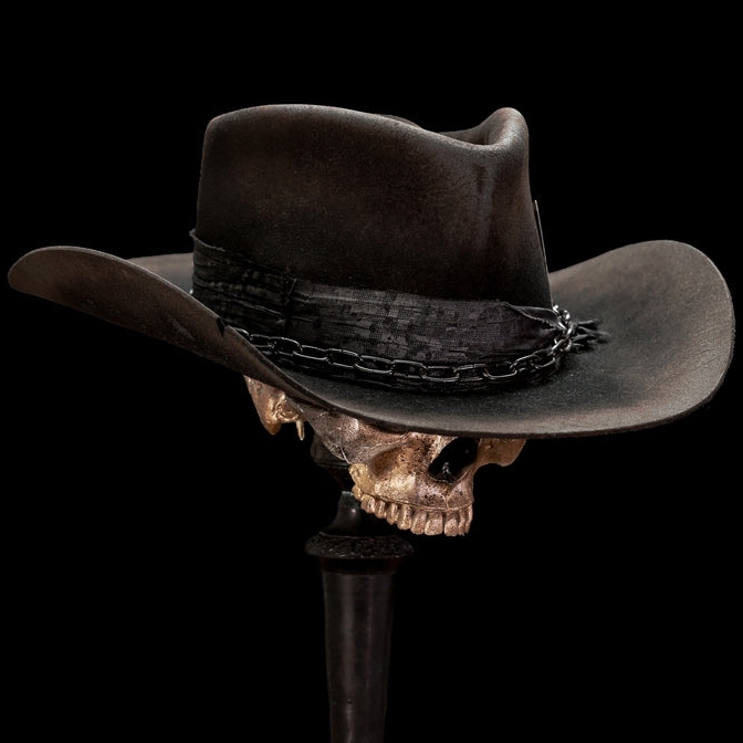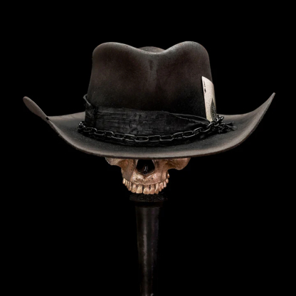 Inspired by the legendary frontman of Motörhead! This black European Hare Teardrop with a cowboy curl is tough as nails. A healthy amount of distress and killer lines. Finished with distressed black fabric wrap, large black chain, and distressed ace of spades card. “The only card I need.”