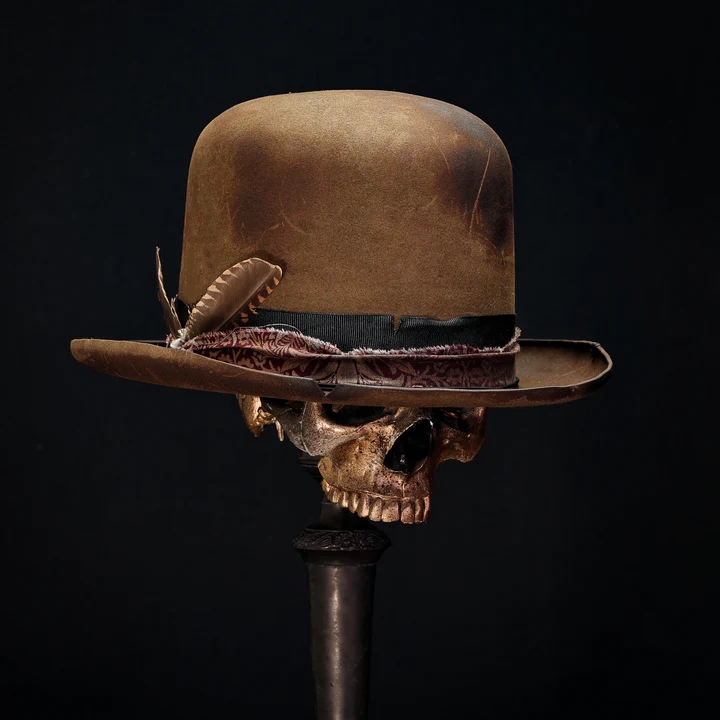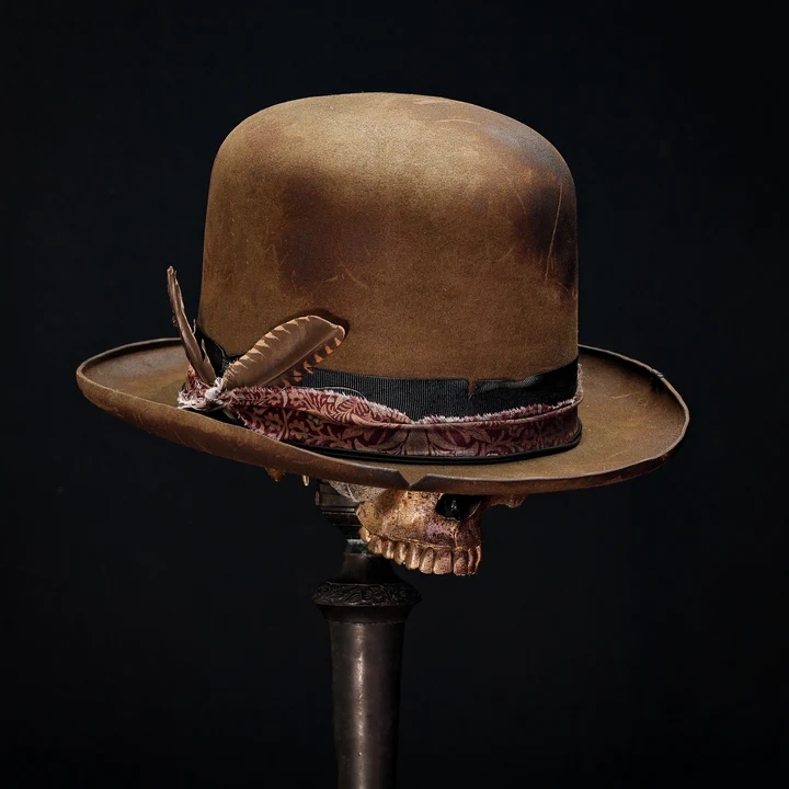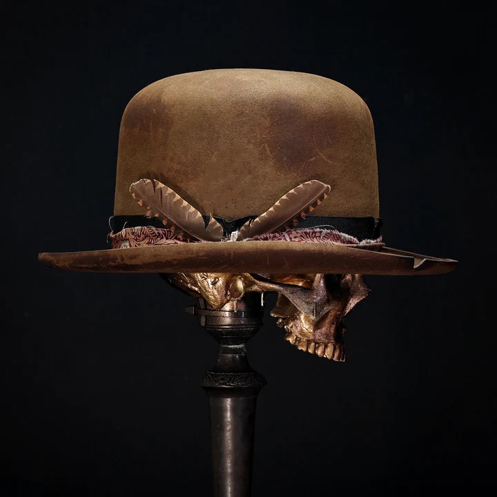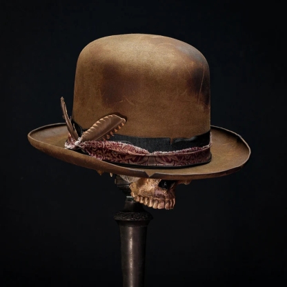 A classic top hat! A distressed 100X hickory with a traditional top hat brim. Wrapped in distressed black grosgrain, tarnished William Morris fabric and a black leather cord. Finished with double feather detail and dice engraving.
