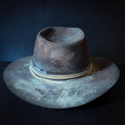 The “Red River Soldier” is a vintage Beaver fur hat that has been reconstructed by Craftsman Hat. 8x Beaver fur, size 7 1/4, distressed to look battle worn complete with the cavalry pin. Black, weathered hat with tattered black grossgrain band and distressed acorn band.