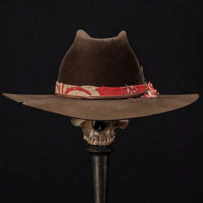 A road warrior for sure! This 100X Beaver Cattleman in Dark Brown is solid with its subtle and deadly trail breaker brim. Wrapped in American dead stock fabric and finished with a nice big feather and a Winchester rifles collectors card tucked in the side.